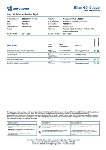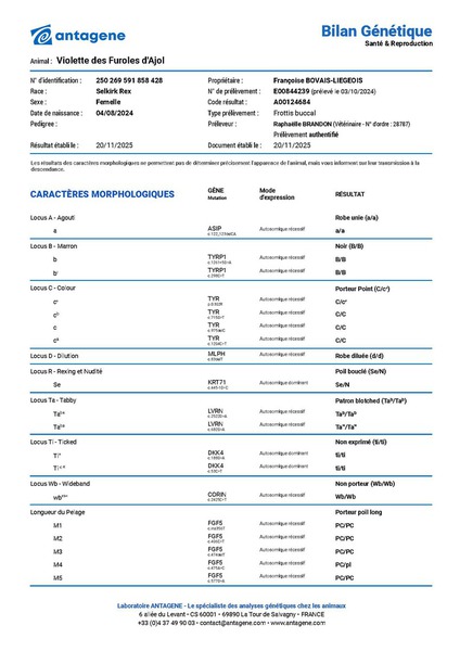 Vous trouverez son bilan génétique (actualisé au 20/11/2025) ci-dessous :