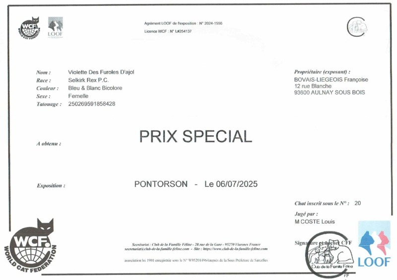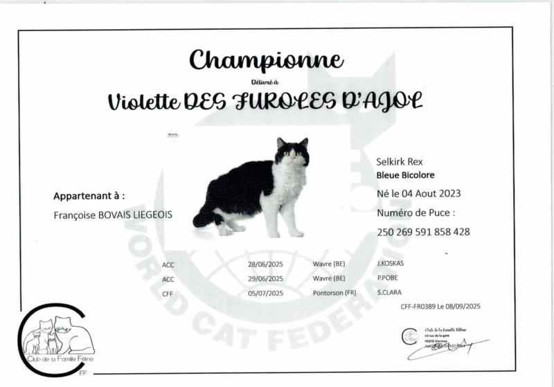 Le Week-end des 28 et 29/06/2025, à l'exposition féline internationale de Wavre (Belgique), organisée par l'ACCB.BE au Manifagri, Violette a obtenu :