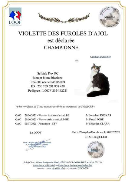 Comme tous les "Furoles d'Ajol", Violette jouit d'un pedigree LOOF (chat de race né en France) DNA certifié sur la filiation.