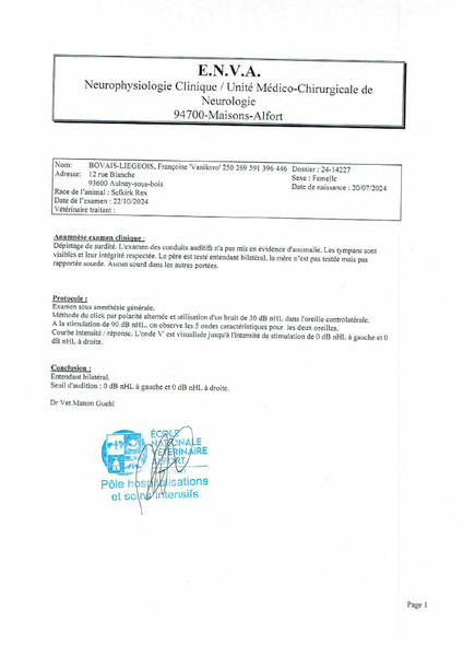 Vanikoro est une femelle blanche Poil long aux yeux OR intense (SRL w 62) qui a satisfait au dépistage de surdité (test de BAER - PAE) "Entendant bilatéral" et cliniquement saine sur le plan cardiaque et rénal (tests pro-BNp et SDMA normaux). Elle est de groupe sanguin "A" (porteuse b).