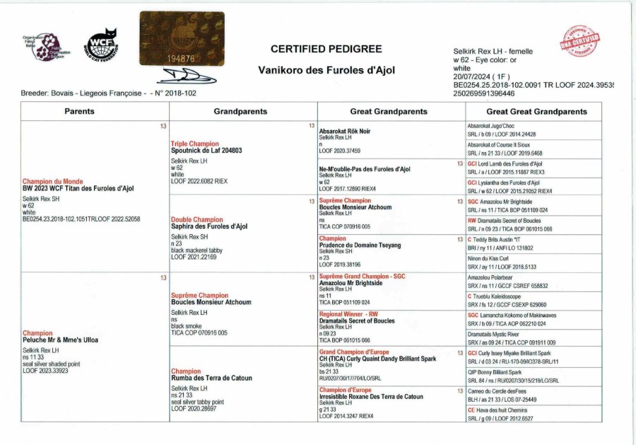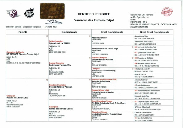 Elle présente une consanguinité de 5,76% en raison de la présence de Triple meilleur de race / Meilleur mâle au Concours Général Agricole de Paris (2023, 2022 et 2019), LOOF SupCh - ChEur, TICA QGC Boucles Monsieur Atchoum en 4ème génération côté maternel & 3ème génération côté paternel.