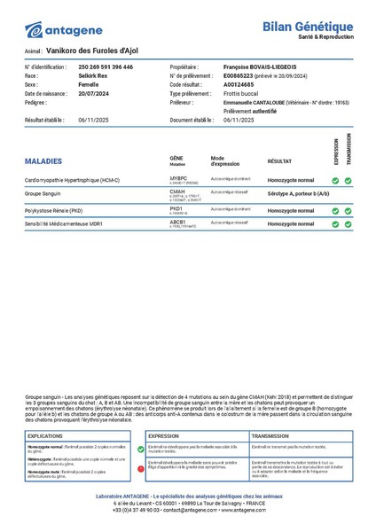 Selon son bilan génétique complet actualisé (06/11/2025), Vanikoro est "rex hétérozygote" poil long :