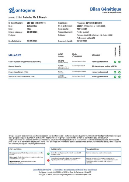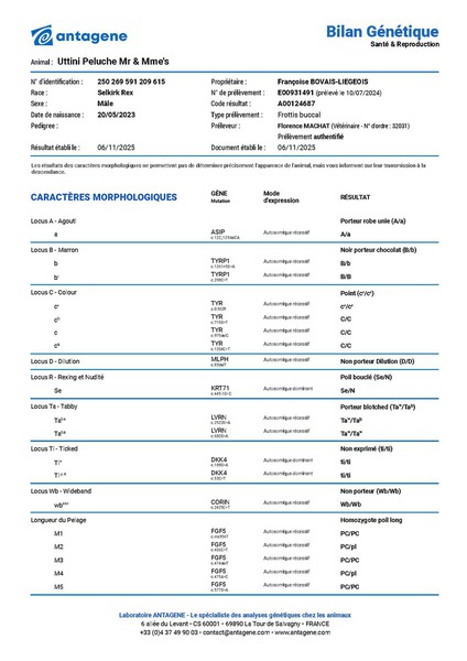 Son bilan génétique complet actualisé (06/11/2025) est le suivant :