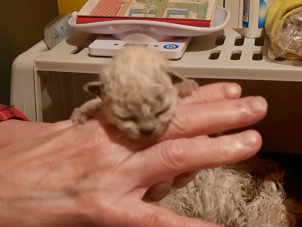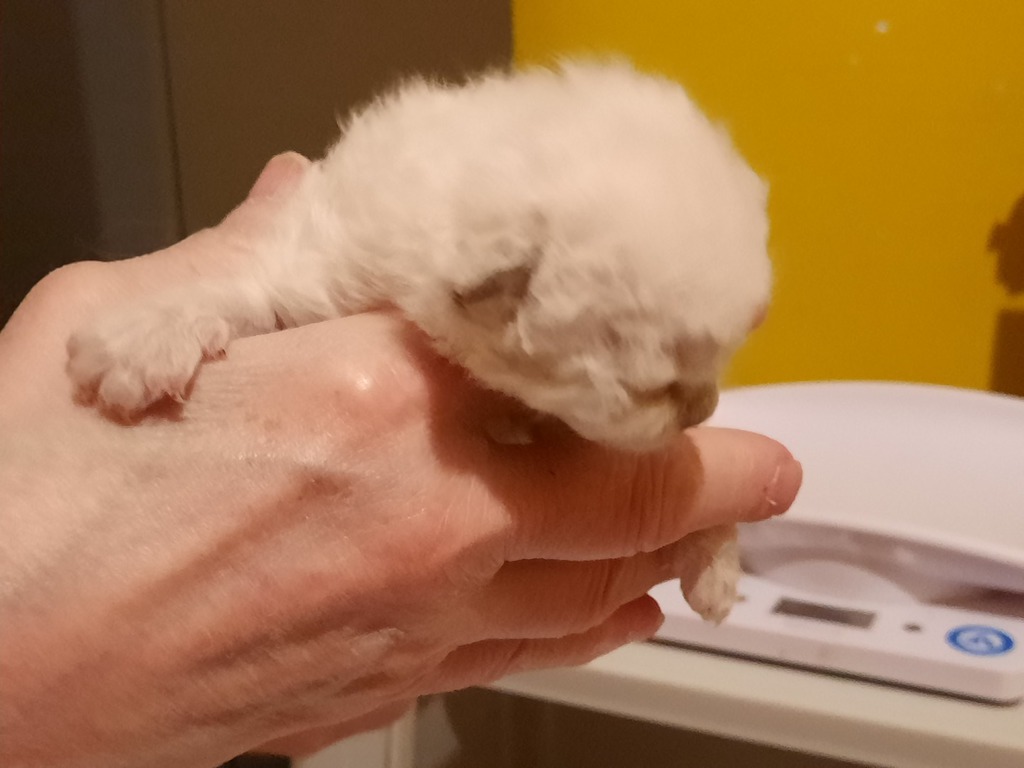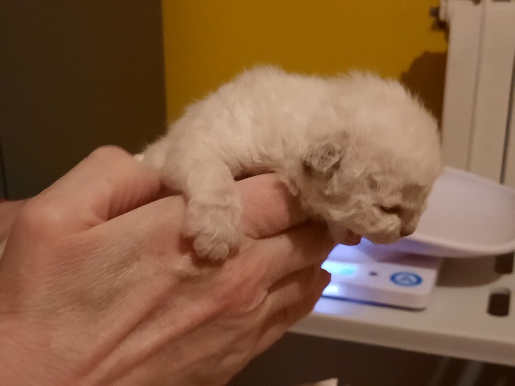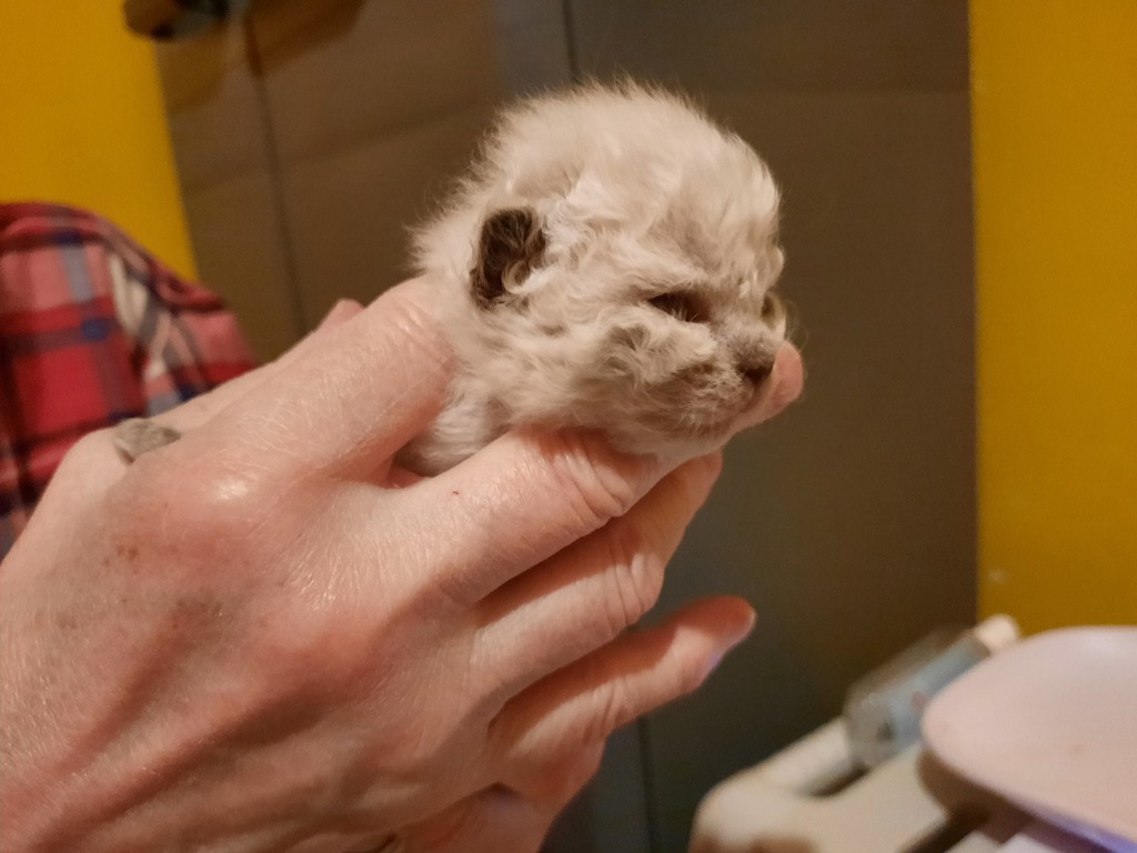 et la couleur rousse mettra plus de temps à sortir (elle pourra ressembler au début à du mouchetis blanc). Les seal ou les bleus naîtront blanc cassé ou coquille d'oeuf.