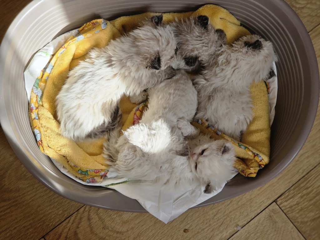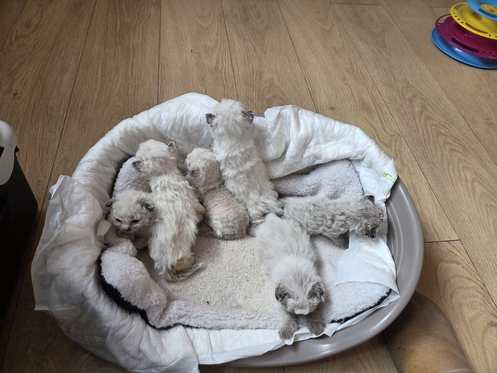 Cette très jolie portée homogène de six chatons poils long, rex hétérozygotes et rex homozygotes (mère rex homozygote) ne comprend que des chatons colourpoint (les deux parents le sont) dont une partie panachée de blanc (arlequin comme la mère).